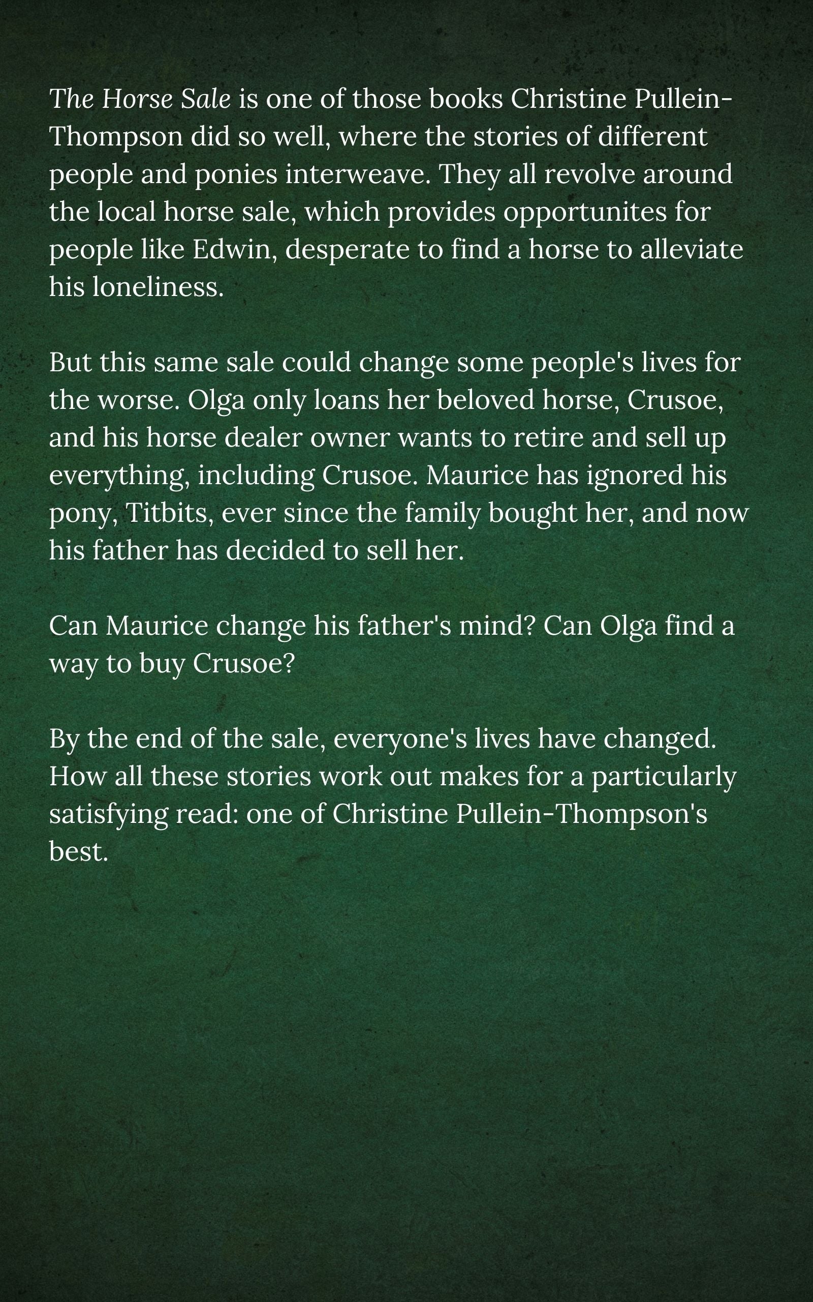 By the end of the sale, everyone's lives have changed. How all these stories work out makes for a particularly satisfying read: one of Christine Pullein-Thompson's best.