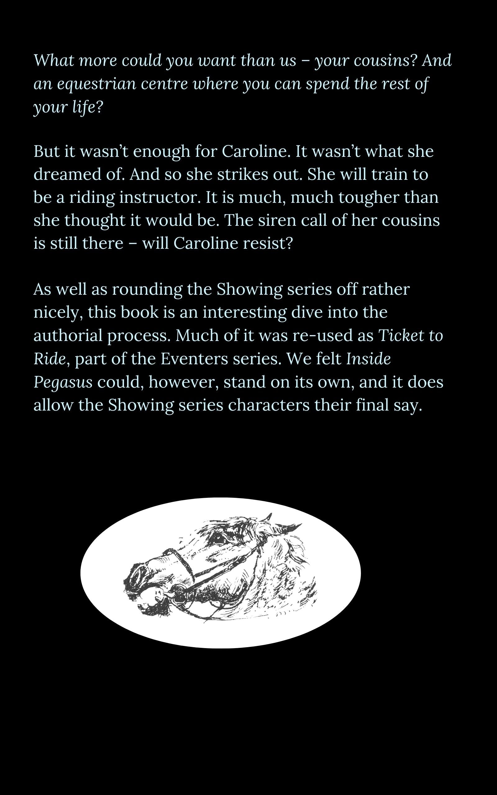 As well as rounding the Showing series off rather nicely, this book is an interesting dive into the authorial process. Much of it was re-used as Ticket to Ride, part of the Eventers series. We felt Inside Pegasus could, however, stand on its own, and it does allow the Showing series characters their final say.