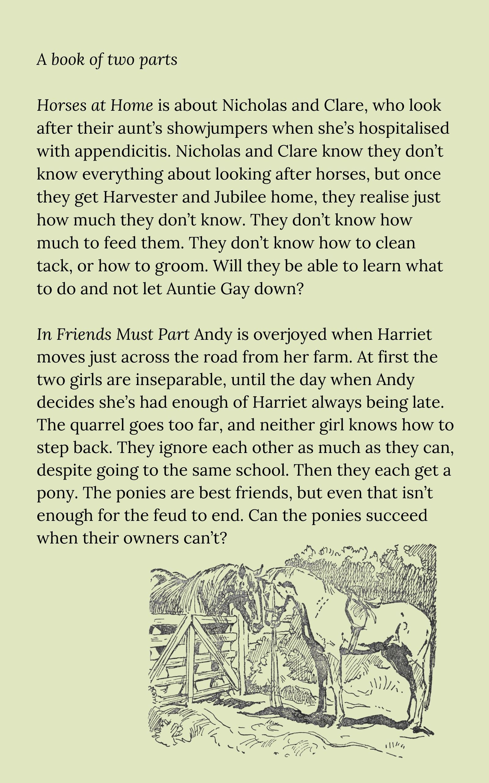 In Friends Must Part Andy is overjoyed when Harriet moves just across the road from her farm. At first the two girls are inseparable, until the day when Andy decides she’s had enough of Harriet always being late. The quarrel goes too far, and neither girl knows how to step back. They ignore each other as much as they can, despite going to the same school. Then they each get a pony. The ponies are best friends, but even that isn’t enough for the feud to end. Can the ponies succeed when their owners can’t?