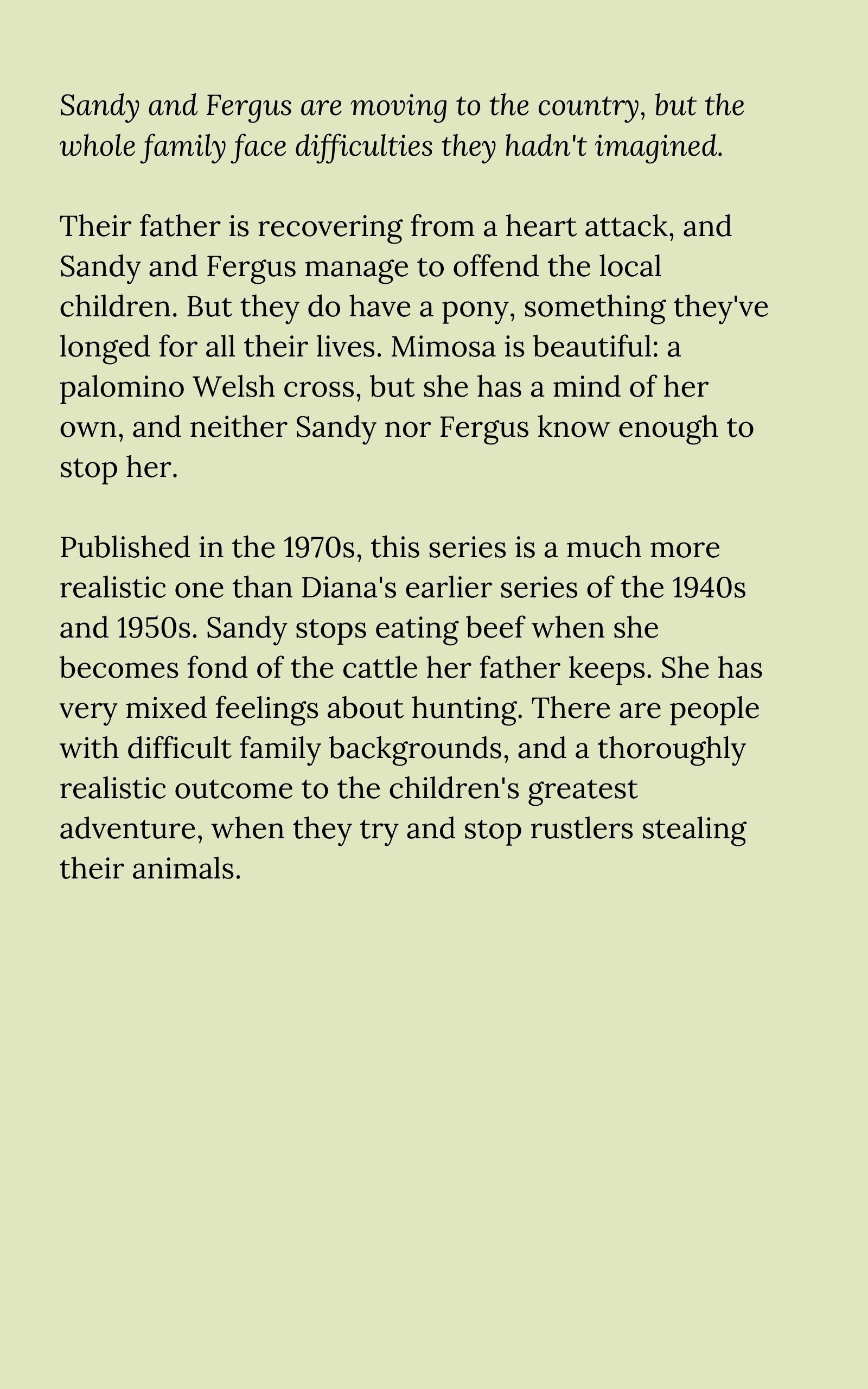 Sandy and Fergus are moving to the country, but the whole family face difficulties they hadn't imagined. Their father is recovering from a heart attack, and Sandy and Fergus manage to offend the local children. But they do have a pony, something they've longed for all their lives. Mimosa is beautiful: a palomino Welsh cross, but she has a mind of her own, and neither Sandy nor Fergus know enough to stop her.
