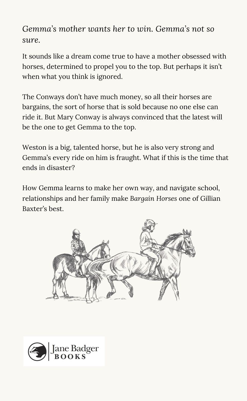 How Gemma learns to make her own way, and navigate school, relationships and her family make Bargain Horses one of Gillian Baxter’s best.