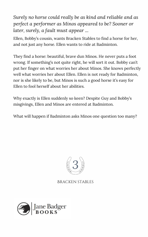 They find a horse: beautiful, brave dun Minos. He never puts a foot wrong. If something’s not quite right, he will sort it out. Bobby can’t put her finger on what worries her about Minos. She knows perfectly well what worries her about Ellen. Ellen is not ready for Badminton, nor is she likely to be, but Minos is such a good horse it’s easy for Ellen to fool herself about her abilities.