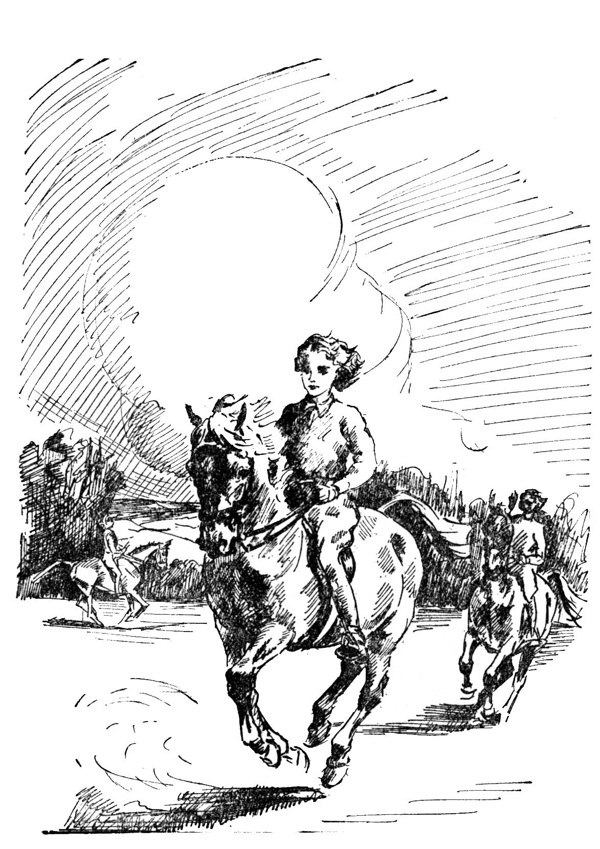 I remember that, during the first two days I was at Tree Tops, I thought my cousins would never forget the gymkhana; they were exasperating. When I remarked to Stephen that his pony, Sandy, had a nice intelligent head, he hooted with laughter and said, sarcastically, that he was sure that he couldn’t be nearly so intelligent as Dominoe, because he hadn’t learned how to avoid bending races yet. When I asked if I might have a tiny ride on Barbara’s pony, Sweep, she told me that he had been carefully schooled by an expert and that she didn’t want me to spoil him and teach him to take charge of people. When I asked any of them questions about schooling ponies, they said that they thought I hated them and didn’t want to learn from them. Luckily it soon wore off, although they never offered me a ride on their ponies.