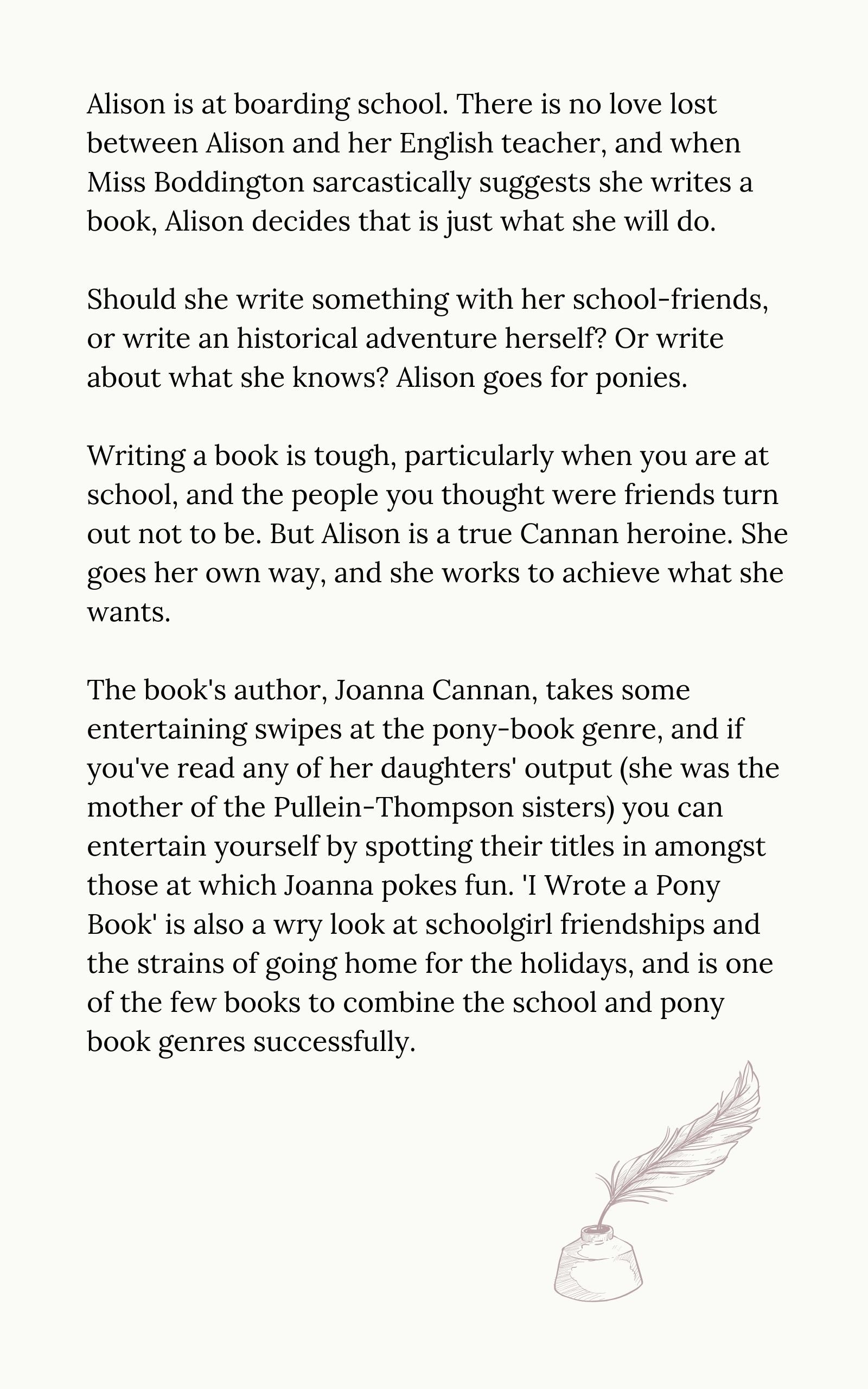 The book's author, Joanna Cannan, takes some entertaining swipes at the pony-book genre, and if you've read any of her daughters' output (she was the mother of the Pullein-Thompson sisters) you can entertain yourself by spotting their titles in amongst those at which Joanna pokes fun. I Wrote a Pony Book is also a wry look at schoolgirl friendships and the strains of going home for the holidays, and is one of the few books to combine the school and pony book genres successfully.