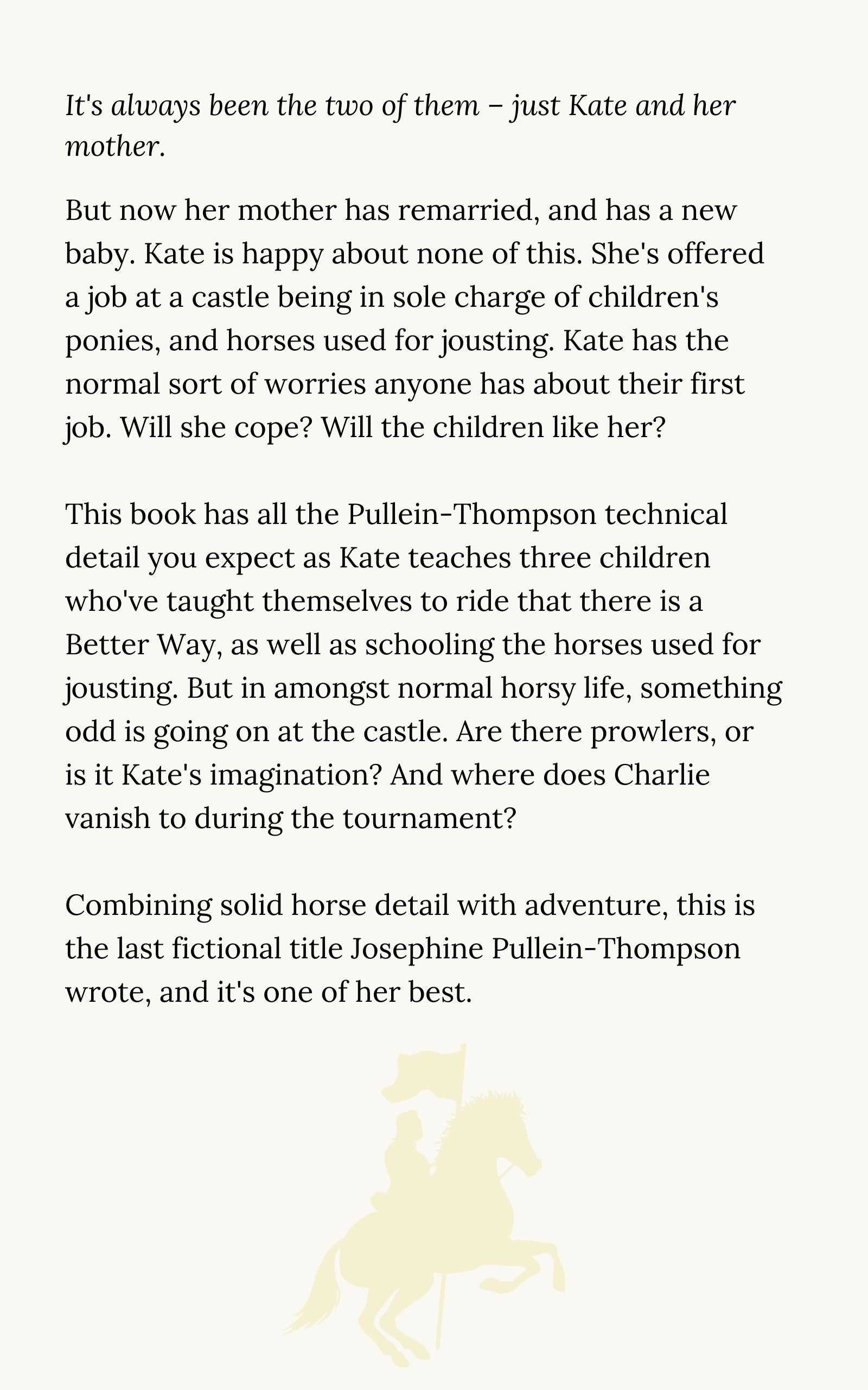 But now her mother has remarried, and has a new baby. Kate is happy about none of this. She's offered a job at a castle being in sole charge of children's ponies, and horses used for jousting. Kate has the normal sort of worries anyone has about their first job. Will she cope? Will the children like her?