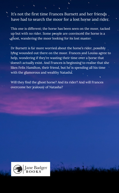It’s not the first time Frances Burnett and her friends have had to search the moor for a lost horse and rider. This one is different; the horse has been seen on the moor, tacked up but with no rider. Some people are convinced the horse is a ghost, wandering the moor looking for its lost master.