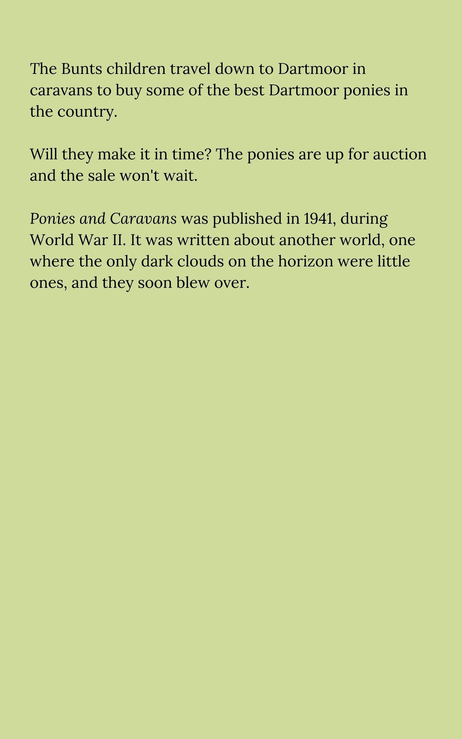 The third and the last of the Bunts series, Ponies and Caravans was published in 1941. Although it was published during World War II, the world it reflects is one where the only dark clouds on the horizon are little ones, and they soon blow over. The children, and some of the adults we've met in other books, travel down to Dartmoor together in caravans so that they can buy some of the best Dartmoor ponies in the country. The charmed world in this book has a particular poignancy when you realise that its earliest readers were living a life of rationing, bombing raids and the threat of invasion. Ponies and Carvans must have seemed like a glimpse into another, and kindlier world.
