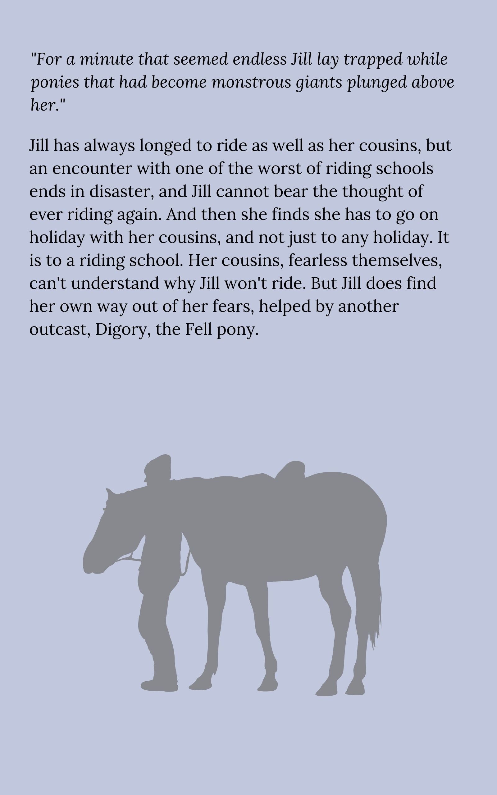 Jill has always longed to ride as well as her cousins, but an encounter with one of the worst of riding schools ends in disaster, and Jill cannot bear the thought of ever riding again. And then she finds she has to go on holiday with her cousins, and not just to any holiday. It is to a riding school. Her cousins, fearless themselves, can't really understand why Jill won't ride. But Jill does find her own way out of her fears, helped by another outcast, Digory, the Fell pony.