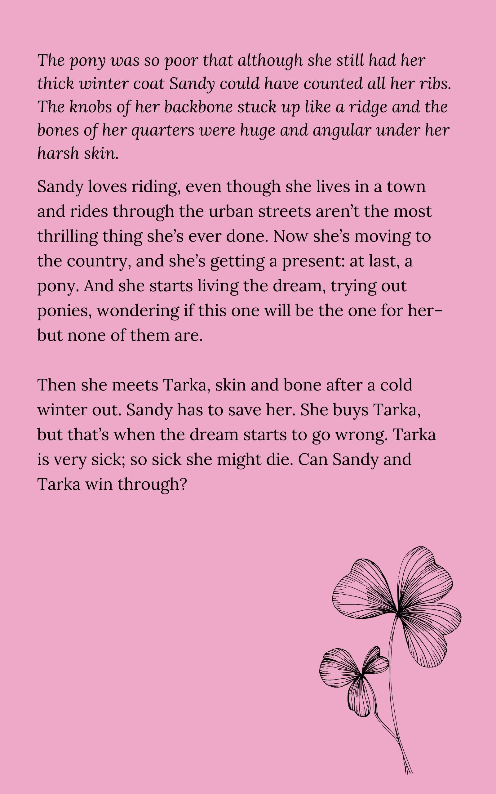 Then she meets Tarka, skin and bone after a cold winter out. Sandy has to save her. She buys Tarka, but that’s when the dream starts to go wrong. Tarka is very sick; so sick she might die. Can Sandy and Tarka win through?