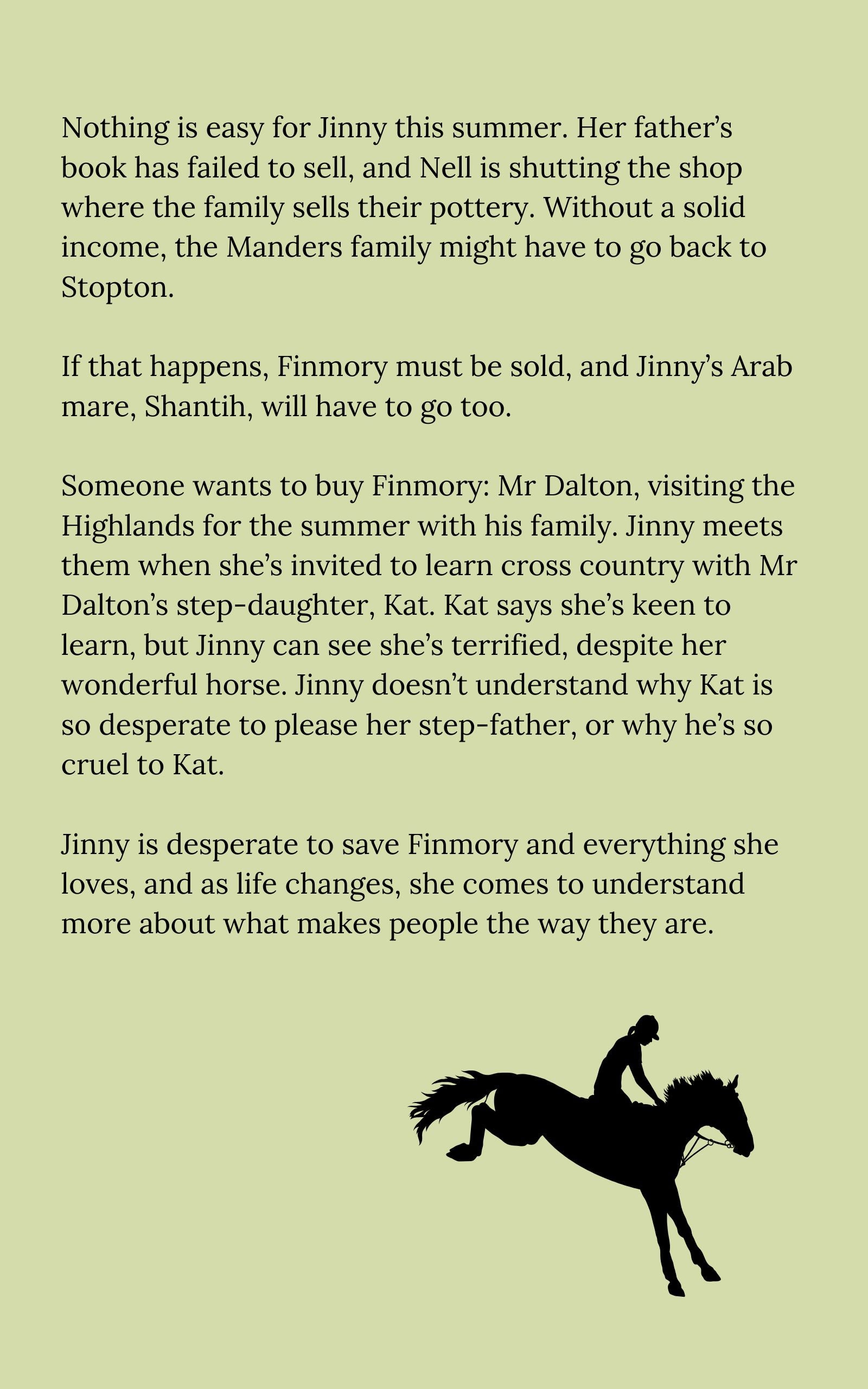 Someone wants to buy Finmory: Mr Dalton, visiting the Highlands for the summer with his family. Jinny meets them when she’s invited to learn cross country with Mr Dalton’s step-daughter, Kat. Kat says she’s keen to learn, but Jinny can see she’s terrified, despite her wonderful horse. Jinny doesn’t understand why Kat is so desperate to please her step-father, or why he’s so cruel to Kat.