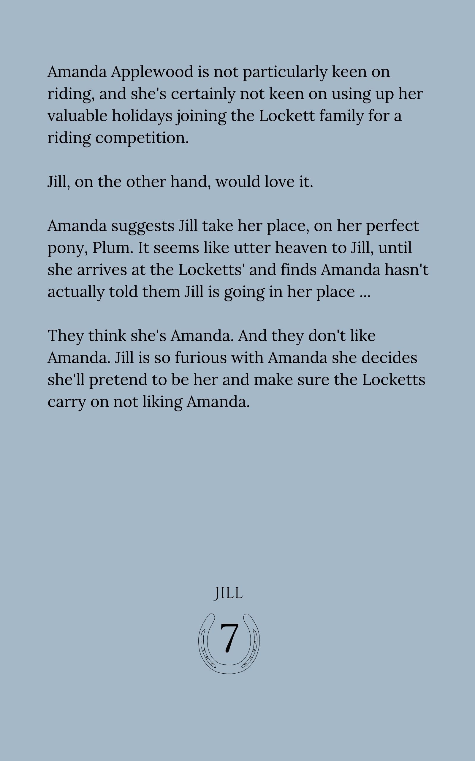 Amanda Applewood is not particularly keen on riding, and she's certainly not keen on using up her valuable holidays joining the Lockett family for a riding competition. Jill, on the other hand, would love it. Amanda suggests Jill take her place, on her perfect pony, Plum. It seems like utter heaven to Jill, until she arrives at the Locketts' and finds Amanda hasn't actually told them Jill is going in her place ... They think she's Amanda. And they don't like Amanda. Jill is so furious with Amanda she decides she'll pretend to be her and make sure the Locketts carry on not liking Amanda.