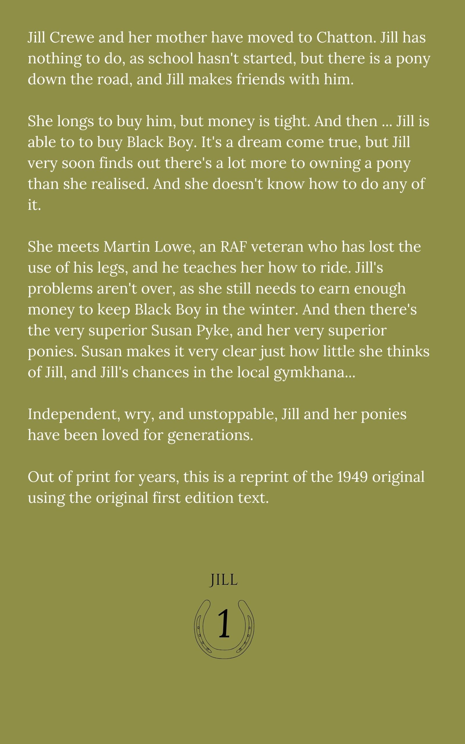 Jill Crewe and her mother have moved to Chatton. Jill has nothing to do, as school hasn't started, but there is a pony down the road, and Jill makes friends with him. She longs to buy him, but money is tight. And then ... Jill is able to to buy Black Boy. It's a dream come true, but Jill very soon finds out there's a lot more to owning a pony than she realised. And she doesn't know how to do any of it.