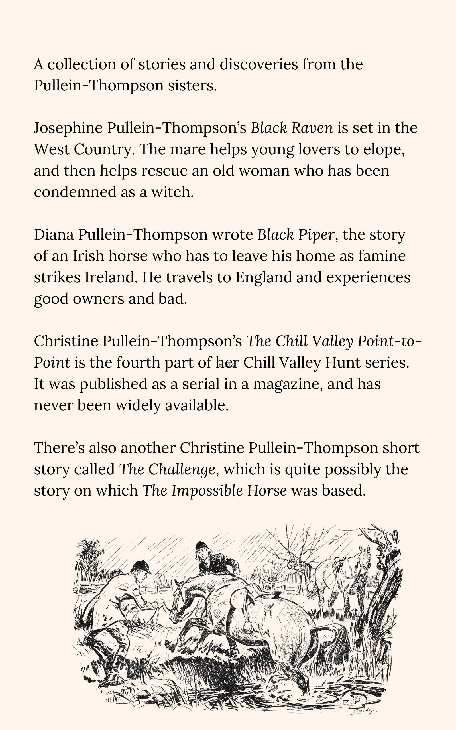 Christine Pullein-Thompson’s The Chill Valley Point-to-Point is the fourth part of her Chill Valley Hunt series. It was published as a serial in a magazine, and has never been widely available. There’s also another Christine Pullein-Thompson short story called The Challenge, which is quite possibly the story on which The Impossible Horse was based.